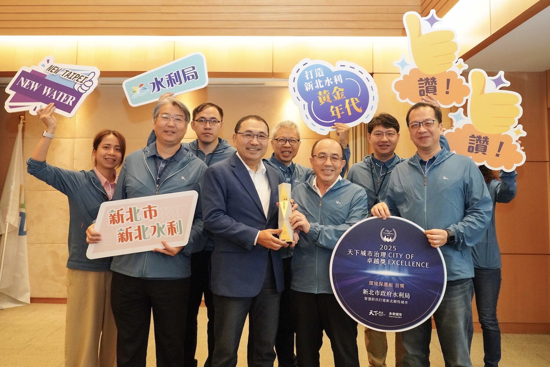 新北市政府水利局以「智慧防汛打造新北韌性城市」專案,勇奪2025年「天下城市治理卓越獎」環境保護組首獎,成為全國唯一獲獎的水利單位。(19)日於市政會議中,水利局長宋德仁代表團隊,將這份殊榮獻給市長侯友宜,新北用AI守護市民,從防洪導向的城市治理模式,進化成「不怕淹」的韌性城市。