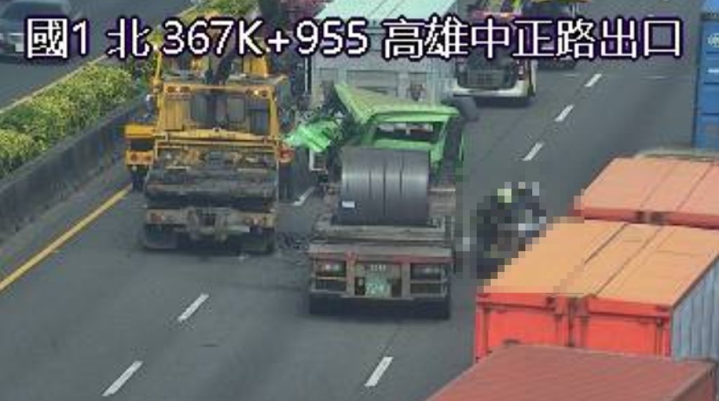 國道1號北向367.9公里,高雄中正路出口,今(21)日上午10時許發生3大車的事故,其中一輛曳引車的車頭嚴重凹陷,駕駛受困車內,警消獲報到場後,花了約15分鐘才順利將人救出,正準備後送醫院。另外這起車禍也造成後方回堵,至於詳細車禍原因還有待進一步調查釐清。