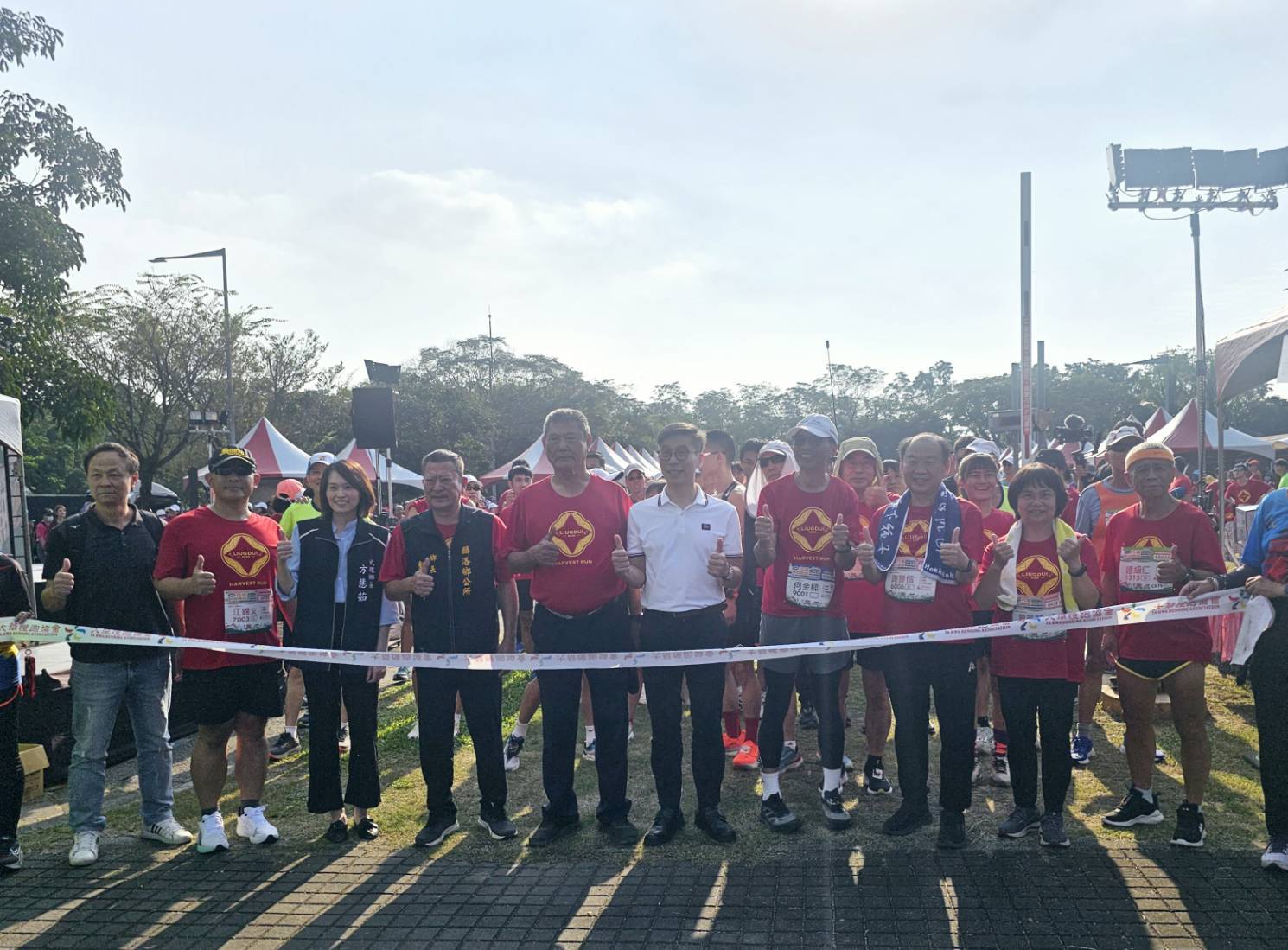 ▲ 2025 六堆秋收路跑熱鬧開跑,起跑前合影(左起曾耀群執行長、江錦文指揮官、方慧茹代理鄉長、鍾慶平鄉長、吳亮慶鄉長、鍾佳濱立法委員、何金樑主任、謝勝信主任) 。(圖/客發中心)