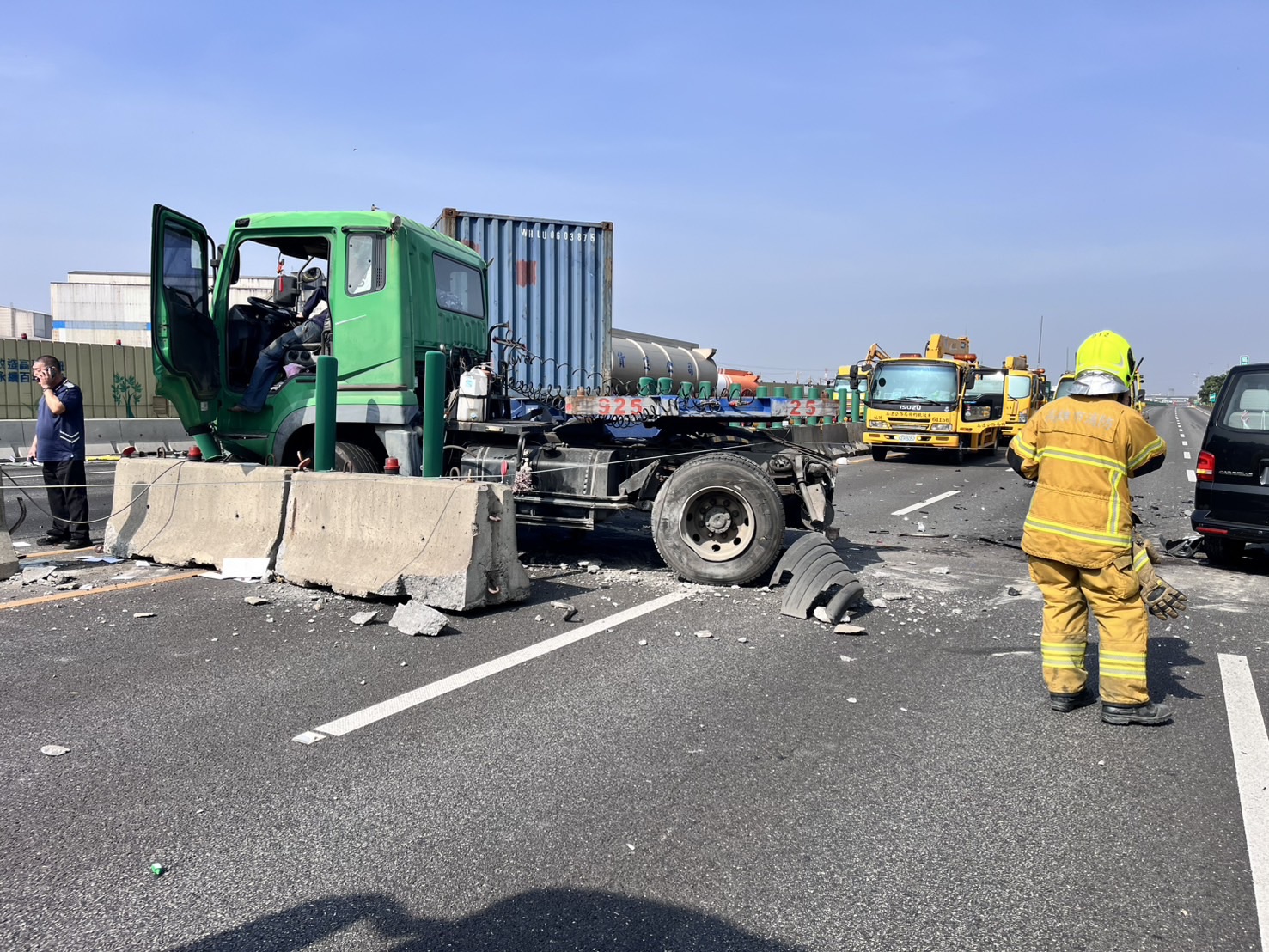 ▲貨櫃車疑似撞擊後波及到隔壁南下路段(圖/記者王俊勝 翻攝)