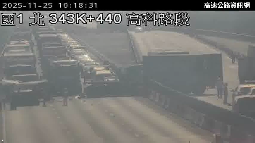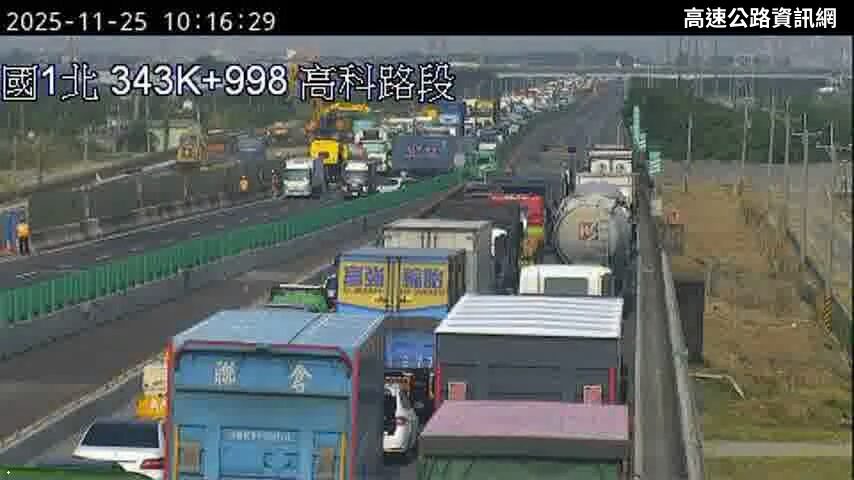 請改道!國道1號今(25)日上午10時10分許南下343.8公里靠近高科—岡山路段驚傳追撞事故!2大貨車與2小車發生追撞,南北雙向大回堵。現場傷亡不明,警方與高公局獲報後緊急趕往排除。