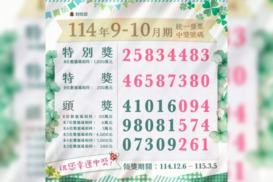 財政部今(25)日公布114年9、10月統一發票中獎號碼,1000萬元「特別獎」的8位號碼為「25834483」;200萬元「特獎」8位號碼為「46587380」;另外3組20萬元「頭獎」的8位號碼分別是「41016094」、「98081574」、「07309261」。