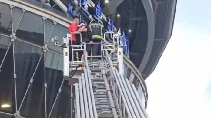 駕車闖入台鐵基隆車站的黃姓通緝犯躲在車站頂棚被逮,警消利用雲梯車將他載下送醫。翻攝畫面