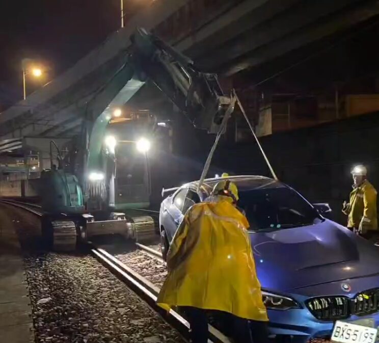 台鐵工務段人員以怪手將闖入軌道自小客車移除。翻攝畫面