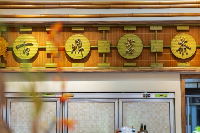 店內最醒目的「古鼎茗茶」竹構字牌,象徵著品牌的精神——以自然為本、以茶為心。每一個字都像是在提醒人們,慢下來,讓生活重新回歸平衡。