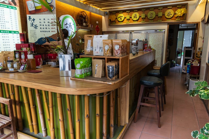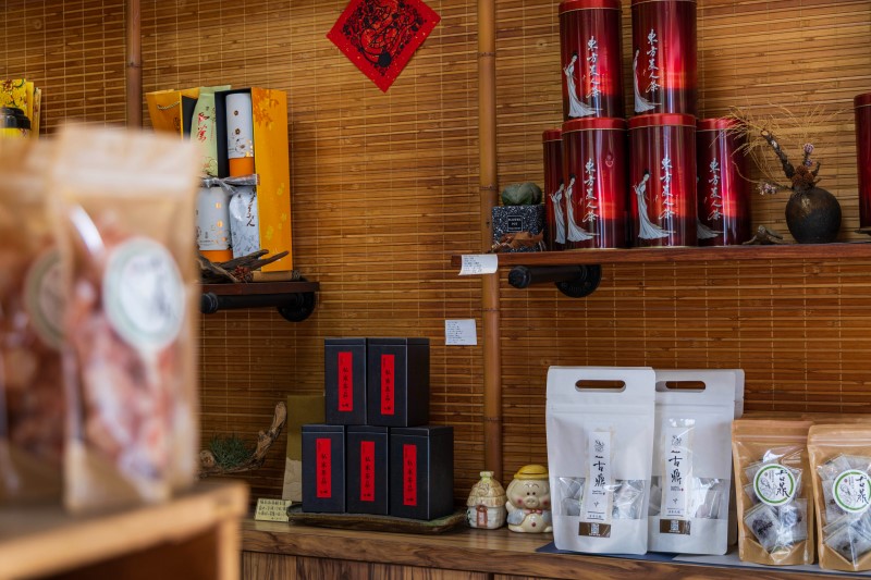 店內環境十分耐人尋味,走進其中,能清楚感受到竹香、木香與茶香交融成一股令人放鬆的氣息。木質桌面上,擺放著不同茶品與草本素材。從青草香氣到紅棗桂圓,每一款都承載著職人對風味的講究。竹製吧台不僅是製茶之處,更是茶香交流的舞台。竹牆之上,擺放著各式茶罐與禮盒,象徵著「送禮也是分享健康」的心意。從台東高山茶到私房養生茶,每一份包裝都蘊藏著對生活的敬意。