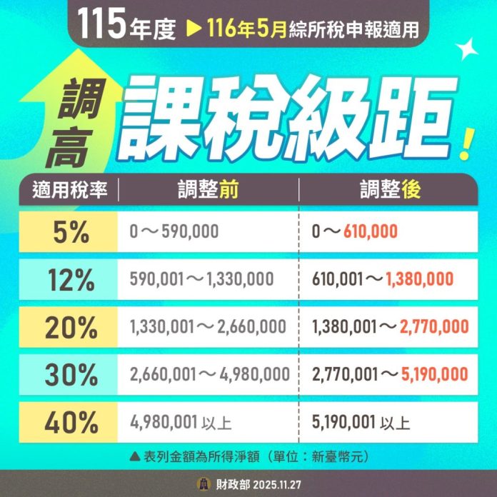 在扣除額方面,免稅額調高至10.1萬元,70歲以上為15.15萬元;標準扣除額,單身13.6萬元、已婚27.2萬元;薪資與身心障礙特別扣除額統一為22.7萬元,同步反映物價上漲壓力。