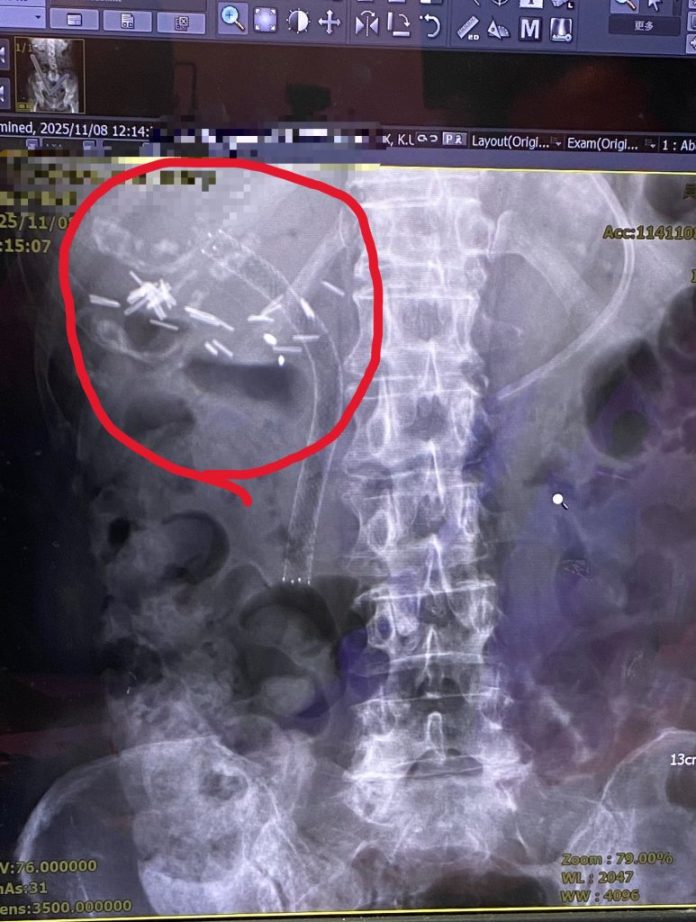 經由逆行性胰膽管鏡檢查發現,原有塑膠支架已完全被膽汁阻塞,使肝內膽管擴張。手術團隊以精準技術使導管通過狹窄處先移除塑膠支架後,再置放金屬膽道支架,讓膽汁得以順利排出。術後X光影像顯示,金屬支架位置良好,膽汁引流恢復正常。患者術後症狀明顯改善,包括腹痛、噁心及黃疸皆逐步消退,肝功能指數亦恢復正常。