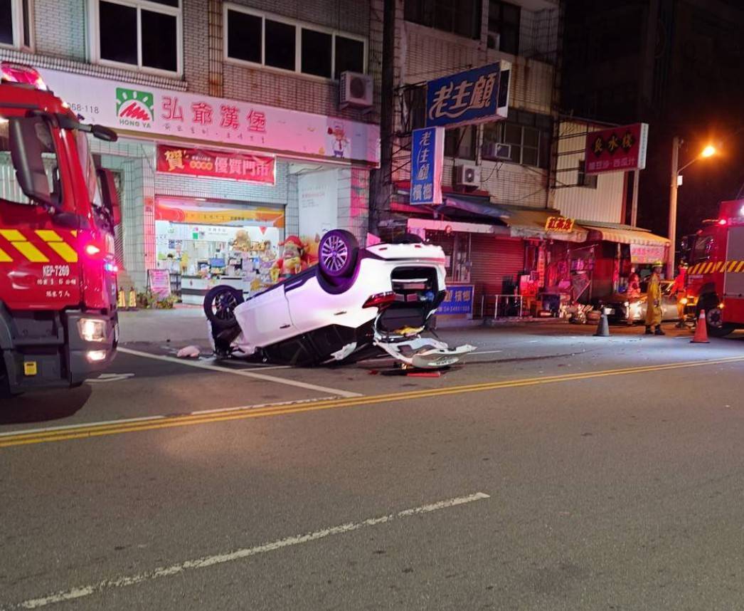 警消人員抵達酒駕撞車翻覆現場調查處理。翻攝畫面