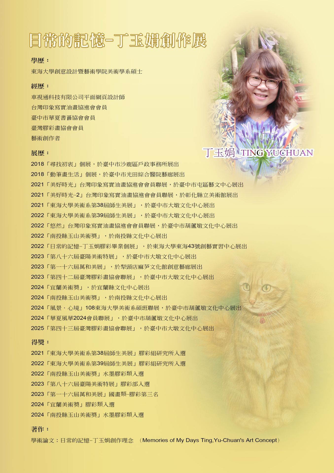 說到丁玉娟,她畢業於東海大學創意設計暨藝術學院美術系碩士,曾任重視通科技公司平面網頁設計師,更是台灣印象寫實油畫協進會、台中市華夏畫協會等多個藝術團體的成員。從2018年開始,她就頻繁在台中各大藝文空間展出作品,包括屯區藝文中心、光田綜合醫院、大墩文化中心等地,都曾留下她的創作足跡。