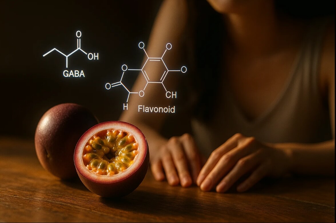 你可能完全沒想到——一顆每天在水果行都能買到的百香果,竟然在近年的神經研究中被重新看見。科學家發現,Passiflora 類植物在動物與前期臨床試驗裡,能透過 GABAergic 神經調節,降低焦躁、縮短入睡時間,甚至減少壓力引起的神經興奮(註1)。百香果(P. edulis)雖然不像 P. incarnata 含有大量 β-carboline 類化合物,但它的多酚與黃酮類活性物質,仍在模型中展現讓大腦「慢下來」的力量(註2)。