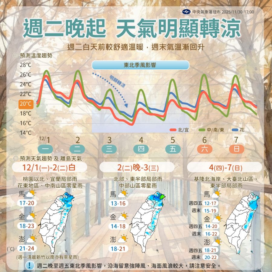 中央氣象署公布未來一周天氣預報,東北季風將於周二(12月2日)晚間增強,氣溫將明顯轉涼,北部、宜蘭有感降溫,預估降至16度左右,周二晚上至周五期間外出記得加件外套。