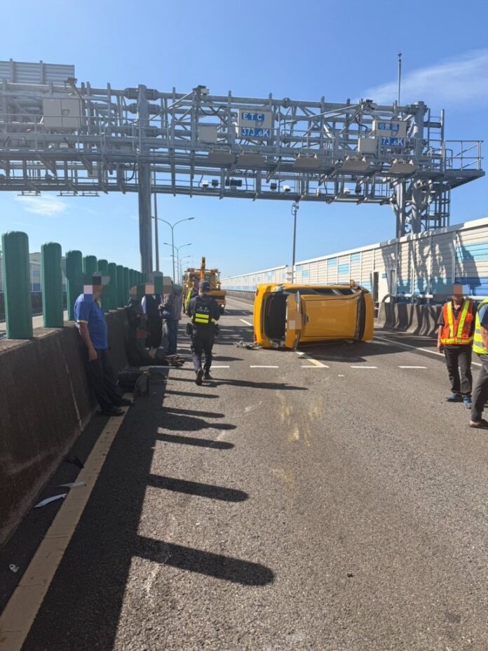 【Lai傳媒、記埋爆料網/周庭慶/高雄報導】國道1號南向373.6公里高雄漁港路段今(1)日發生計程車被撞翻覆事故!上午10時44分,62歲高姓男子駕駛半聯結車行駛該路段內線側車道,疑因變換車道不當,擦撞行駛外側車道由63歲李姓男子駕駛之計程車,致李男車輛翻覆於外側車道而肇事,造成李男及3名乘客手、腳擦挫傷送醫診治。