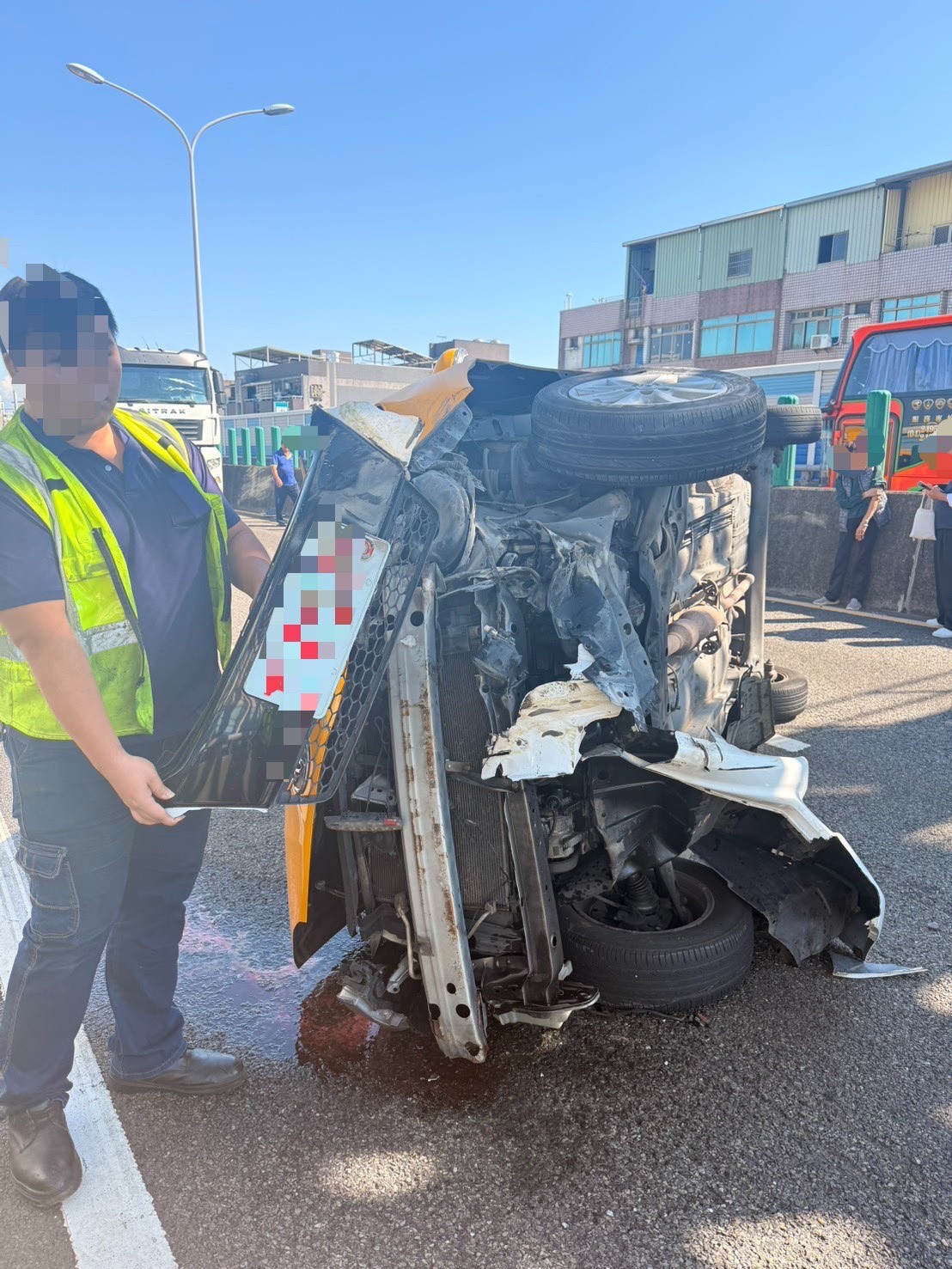 國道1號漁港路計程車被撞翻覆造成4人受傷。翻攝畫面