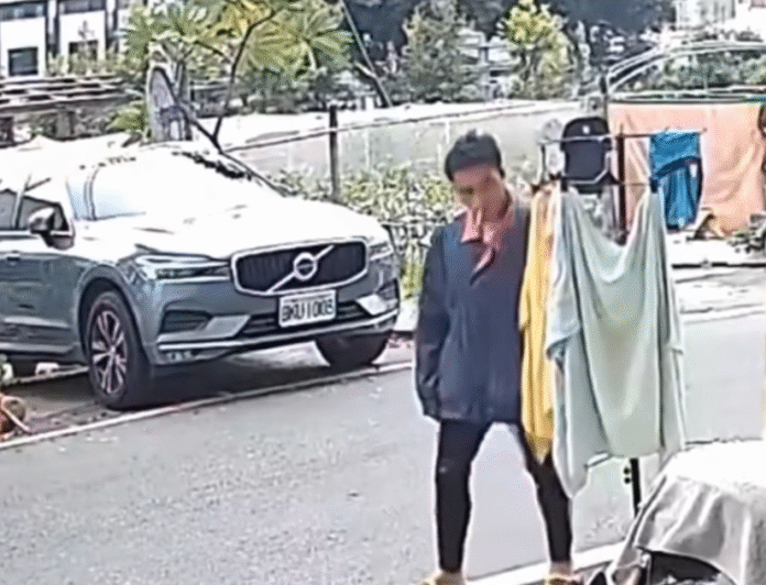 叼煙男子將滷肉飯便當掛在民前的曬衣架上隨即離去。翻攝臉書「社頭人俱樂部」