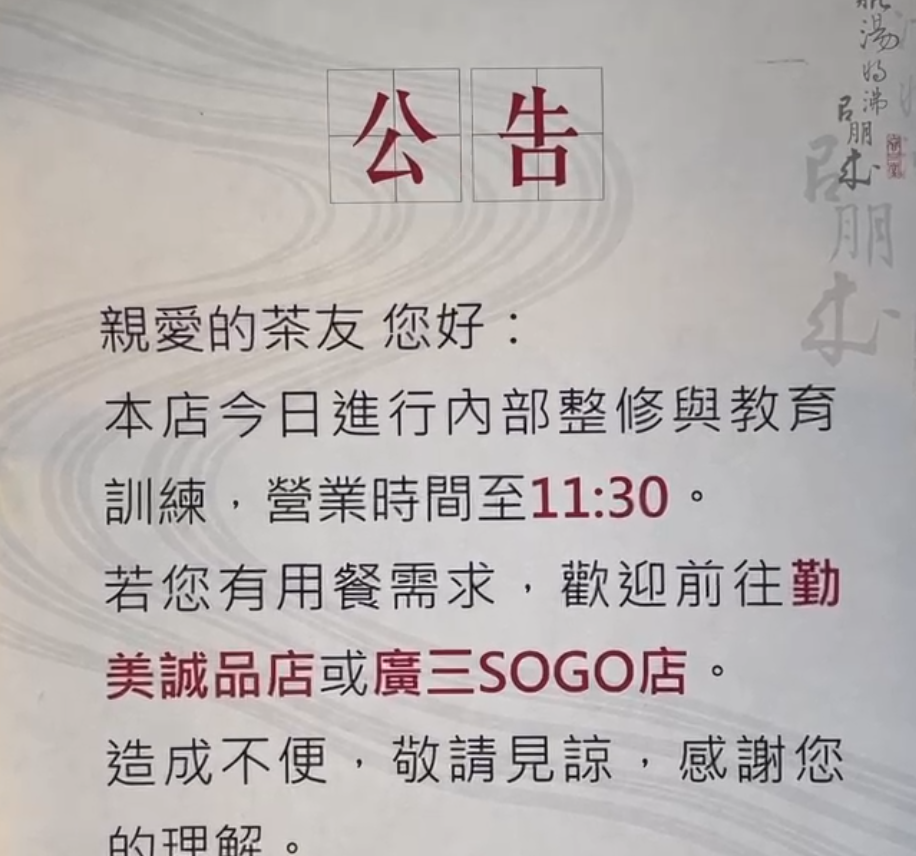 春水堂台中公益店貼出暫停營業公告。翻攝畫面