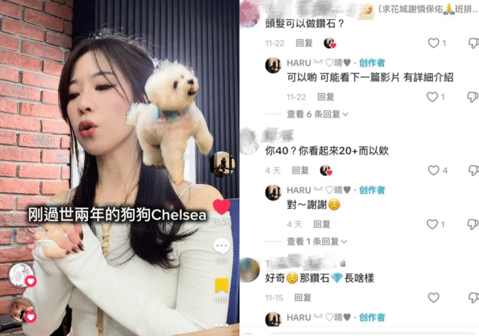 網紅Haru Wang在Tiktok上PO文分享,在自己40歲這一年,送給自己一顆鑽石,不過,這顆DNA鑽石和一般天然礦採鑽石成份一樣,但意義卻完全不同,是集結家人的頭髮及寵物的毛髮一起萃取碳源所培育的DNA鑽石;她在文中提及,我感受到我很愛我的家人,剛好有特別的機會可以把毛髮做成一顆DNA鑽石,我就想不如把我最愛的家人都放進去,而這顆鑽石它不是紀念誰離開,而是提醒我,要好好珍惜還在身邊的每一個人。