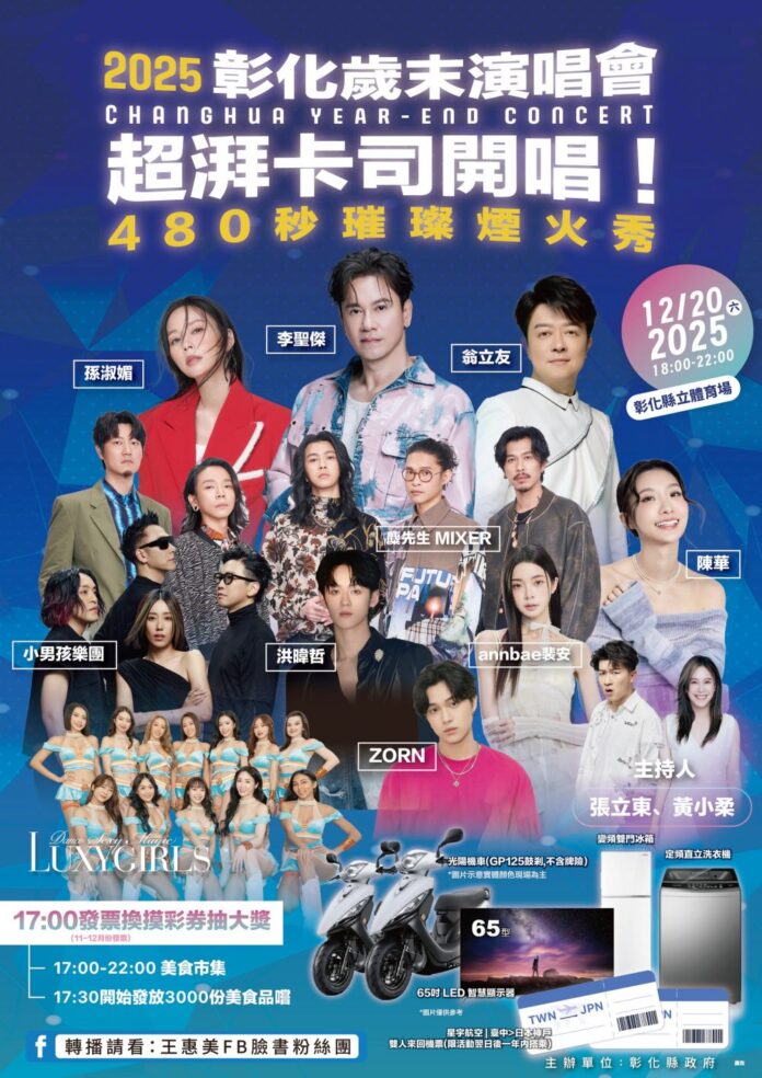 為迎接2026年,彰化縣政府將於12月20日在彰化縣立體育場舉辦「2025彰化歲末演唱會」,12/2日上午在縣府中庭舉辦宣傳記者會。王縣長表示,為與鄉親迎接新年,縣府今年邀請9組老、中、青喜愛的實力歌手輪番開唱,演唱會壓軸邀請到12月26、27日在小巨蛋舉辦個人演唱會的「情歌王子」李聖傑!還有聽團群喜愛的糜先生及小男孩樂團、備受喜愛的創作歌手陳華、唱功深厚的金曲歌后孫淑媚、彰化之光金曲歌王翁立友,還有人氣歌手洪暐哲、鐘卓融Zorn及裴安,陪伴大家用音樂點燃歲末的熱情!以及美食市集與壓軸480秒的絢爛煙火秀,與鄉親一起開心迎接嶄新的2026年。