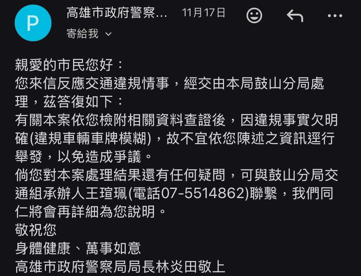 【Lai傳媒、記者爆料網/林承瀚/高雄報導】高雄市一名民眾10月25日在蓮海路段拍到一輛銀色保時捷跨越雙黃線違規超車,氣得把影片上傳檢舉,沒想到過了一個多月,鼓山分局竟回覆「違規事實欠明確(違規車輛車牌模糊)」,不予舉發!
