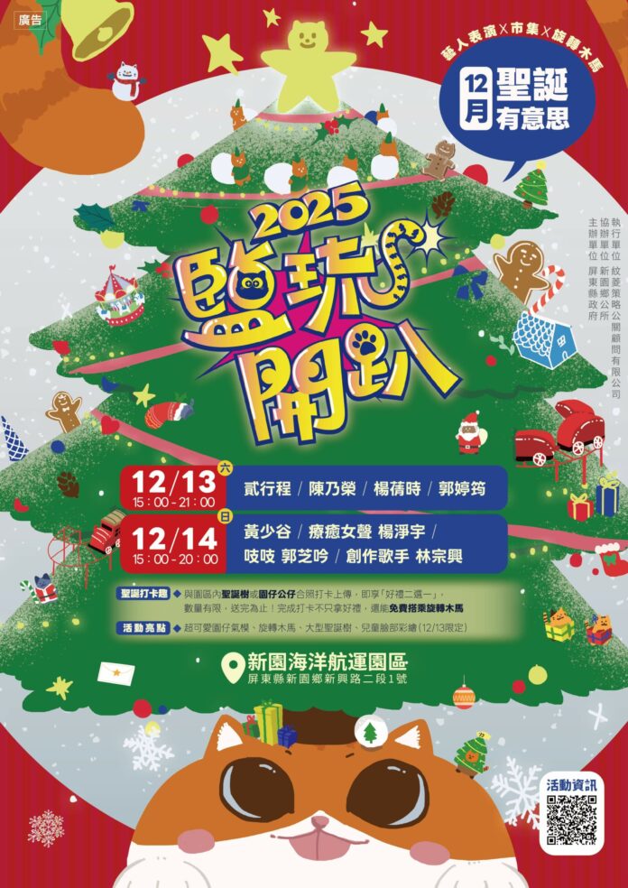 值得注意的是,「聖誕有意思」作為今年鹽琉開趴的壓軸活動,象徵年度活動的最終章,也承載著屏東對遊客的節慶祝福,誠摯邀請全臺民眾攜家帶眷、呼朋引伴,一同前往新園海洋航運園區,用最溫暖愉悅的心情度過這場充滿海味與聖誕味的特別派對。詳細活動內容請上官網:http://www.2025letsgoparty.com/,持續追蹤「屏東GO好玩」與「屏東GO交通」臉書、IG 及Threads,並歡迎下載「屏東GO好玩」、「屏東ㄟ公車」APP 掌握第一手活動訊息。