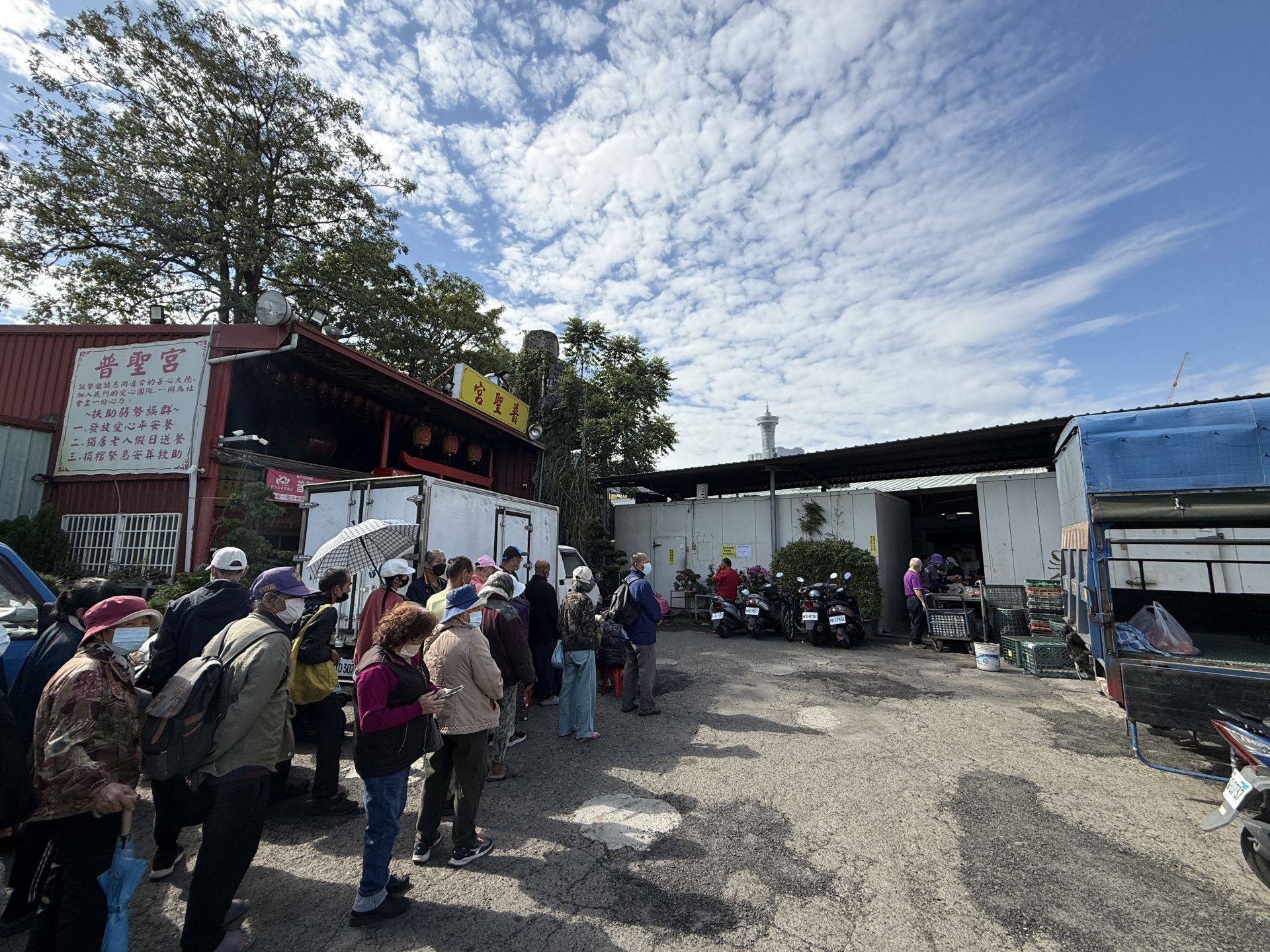 每到發放時間,志工便在普聖宮廟前協助領取,確保長者與行動較不便者都能順利拿到便當。
