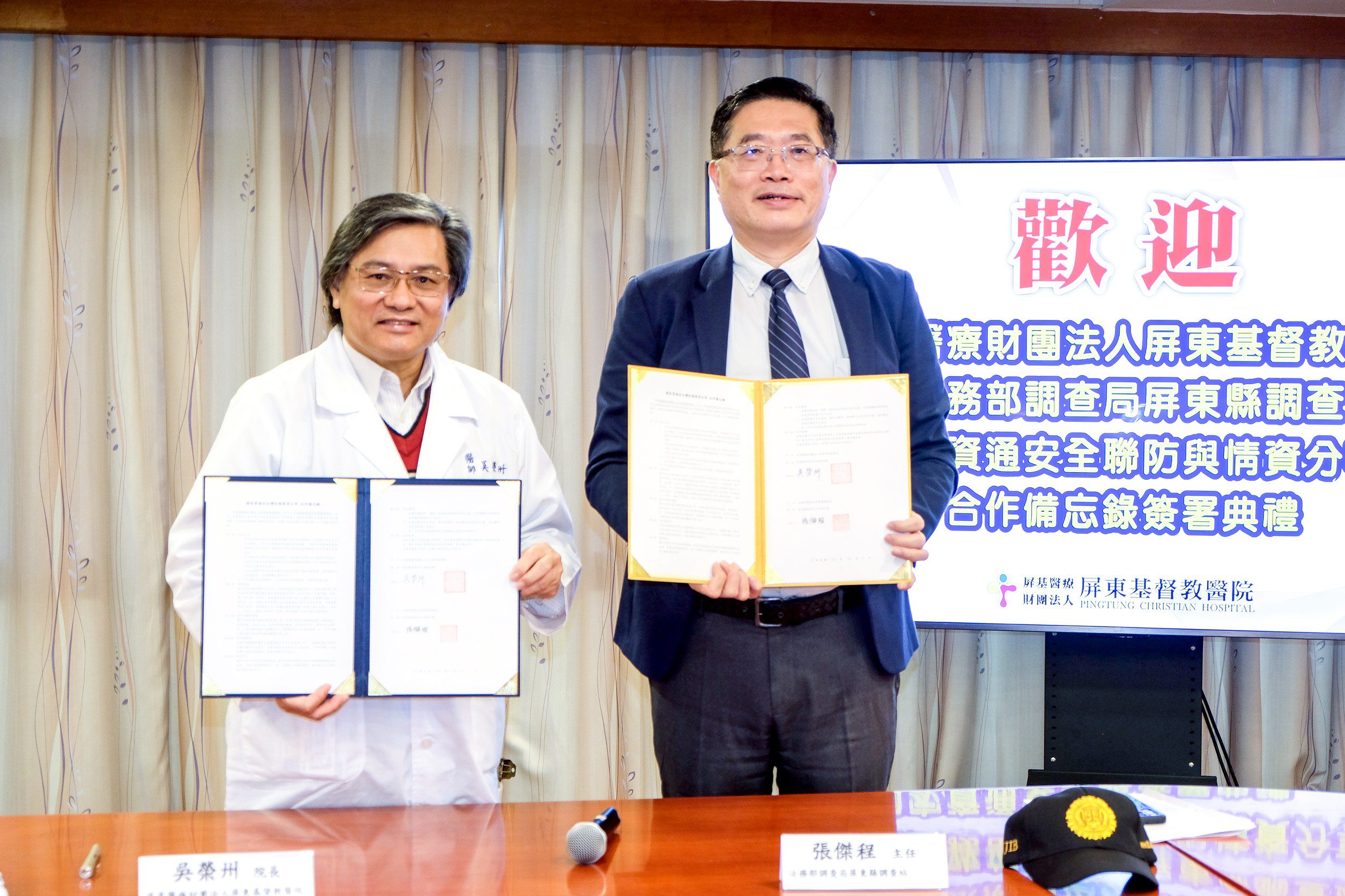 【記者戴英薇/屏東報導】 法務部調查局屏東縣調查站與屏基醫療財團法人屏東基督教(下稱:屏基醫院)於民國114年12月3日簽署「國家資通安全聯防與情資分享合作備忘錄(MOU)」,簽署儀式於屏基醫院六樓小會議室舉行,由屏基醫院吳院長榮州主持,屏東縣調查站張主任傑程代表調查局與屏基醫院簽署合作備忘錄,屏東縣調查站陳副主任宗廉、林祕書三丰、沈組長雲明及鍾組長尚義暨同仁共同觀禮,場面隆重。