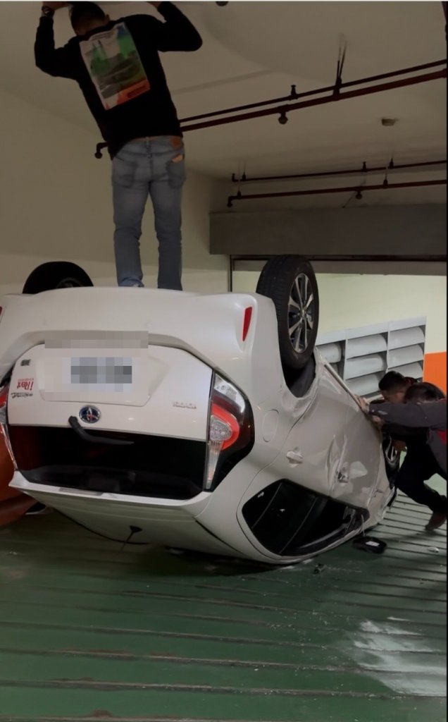 地下停車場也能翻車!租賃車四輪朝天躺平 網友傻眼:這什麼神技能.(圖/翻攝 內壢大小事 出處為threads@niki_hsieh)
