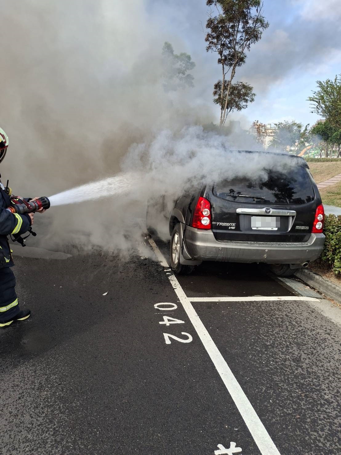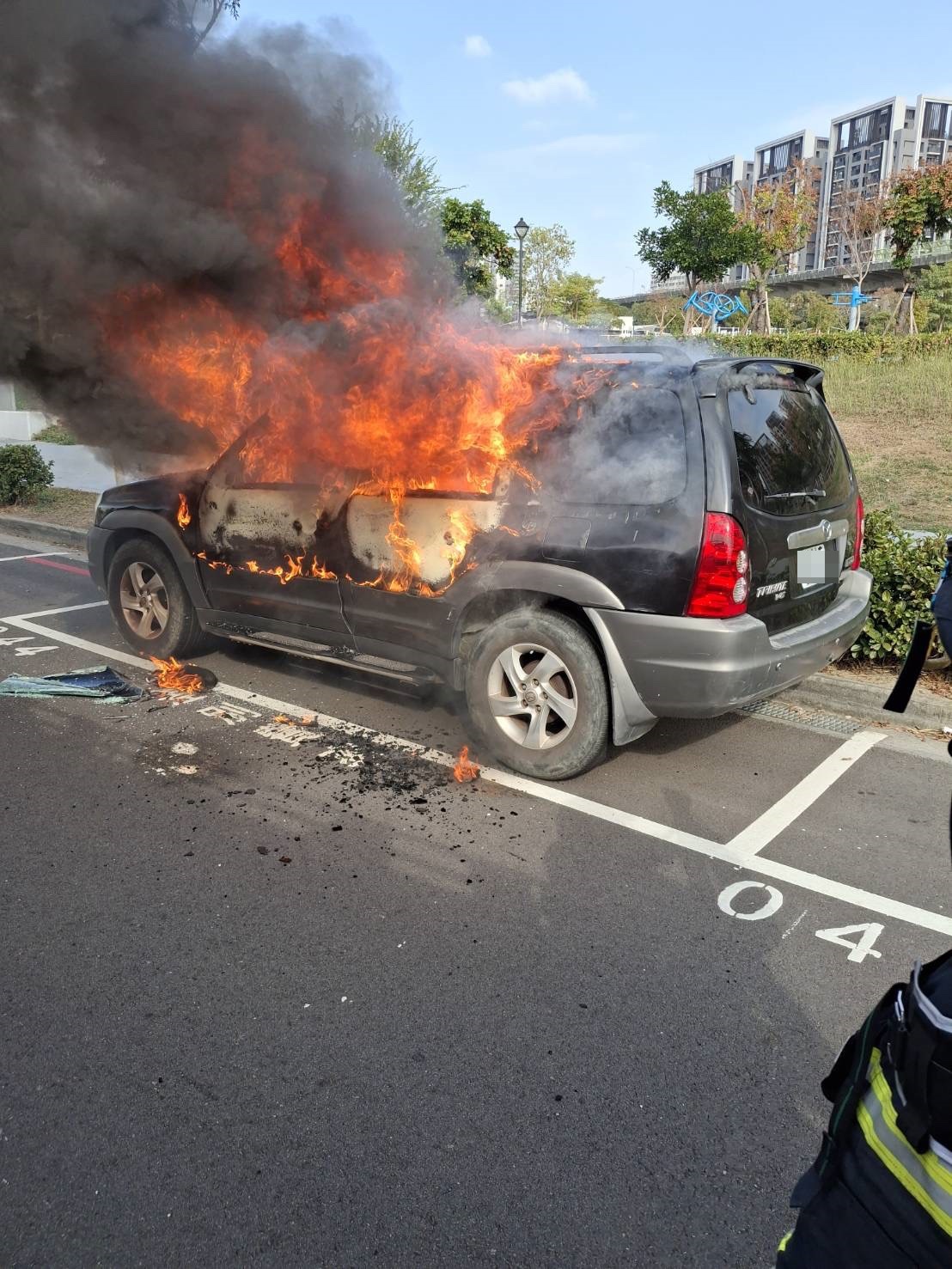 消防隊員發現係停車格內1輛休旅車起火燃燒,經出水灌救,火勢於14時00分控制、14時13分撲滅。現場1名民眾(身分不詳)於駕駛座內已明顯死亡。 據了解死者疑為60多歲的車主,車內有瓶裝不明液體,火警發生前並無人靠近該車,全案警消人員繼續調查中。