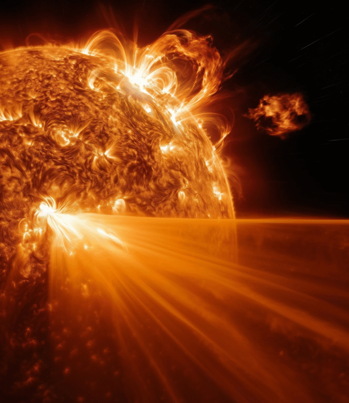 今天美東時間下午3點39分左右,太陽發生了一次面向地球的M8.12級太陽耀斑爆發,並以驚人的速度引發了大規模的太陽海嘯。衝擊波從爆發點迅速擴散,這是近期觀測到的最劇烈的太陽事件之一。由於這次爆發來自太陽正對地球的一側,M8.12級耀斑爆發後,有一團微弱的日冕物質拋射(CME)正離開太陽,帶電粒子和輻射的湧流正朝著地球襲來,可能會增強地球的極光、干擾衛星、通訊和GPS,以及顯著增強地磁活動,增加大氣和地面能量。這次爆發的規模和速度會給地球帶來多大的影響,也引起科學家們的矚目。