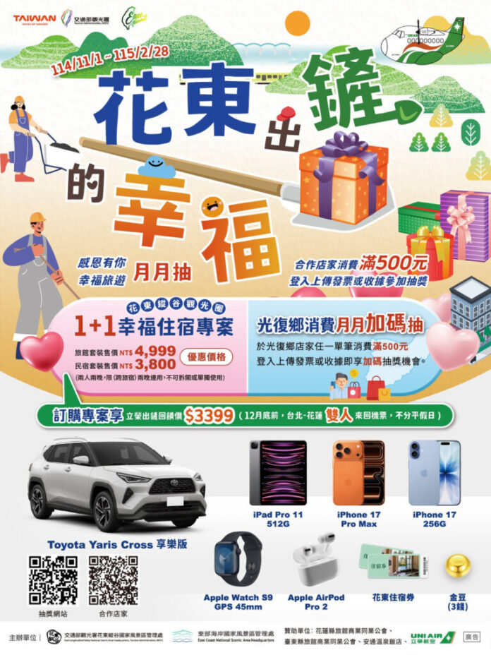 為了讓旅程驚喜再升級,同步推出「花東出『鏟』的幸福!感恩有你!月月送」抽獎活動。活動期間自114年11月1日至115年2月28日止,凡於東區觀光圈 East of Taiwan 合作業者(食、宿、遊、購、行)消費滿500元,即可登錄發票參加抽獎;滿1,000元可享雙倍中獎機會。每月均有住宿券、3C產品及花東大禮包等多項好禮;此外,於光復鄉消費的旅客,更可參加加碼抽獎,有機會獲得iPhone 17與台糖住宿券各1名。活動最終再加碼的「鏟出幸福獎」將送出Toyota Yaris Cross汽車、金豆及多項驚喜大獎,讓旅途幸福滿載,驚喜不斷。