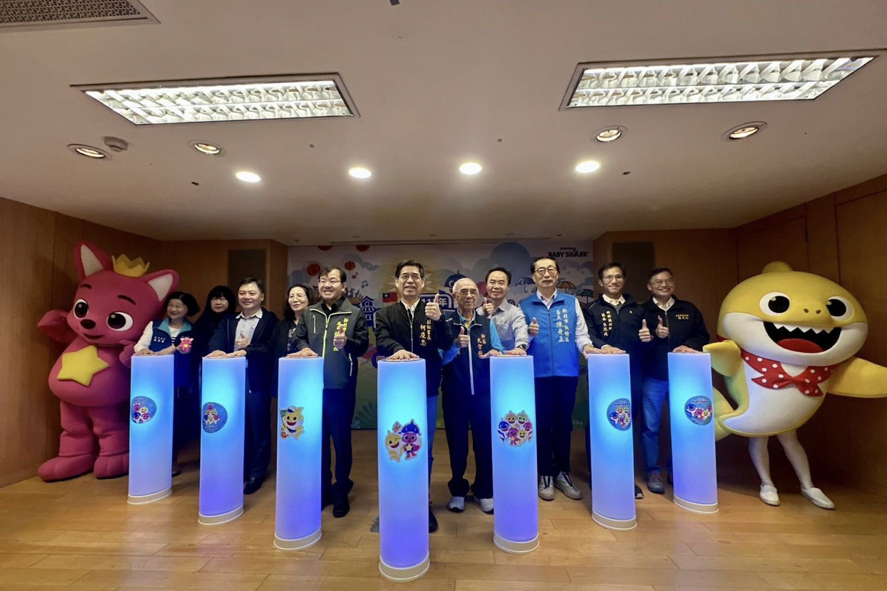 ▲記者會現場開場表演邀請超人氣卡通明星碰碰狐及鯊魚寶寶以歌舞帶動,營造歡樂氣氛。(圖/新北市民政局 提供)