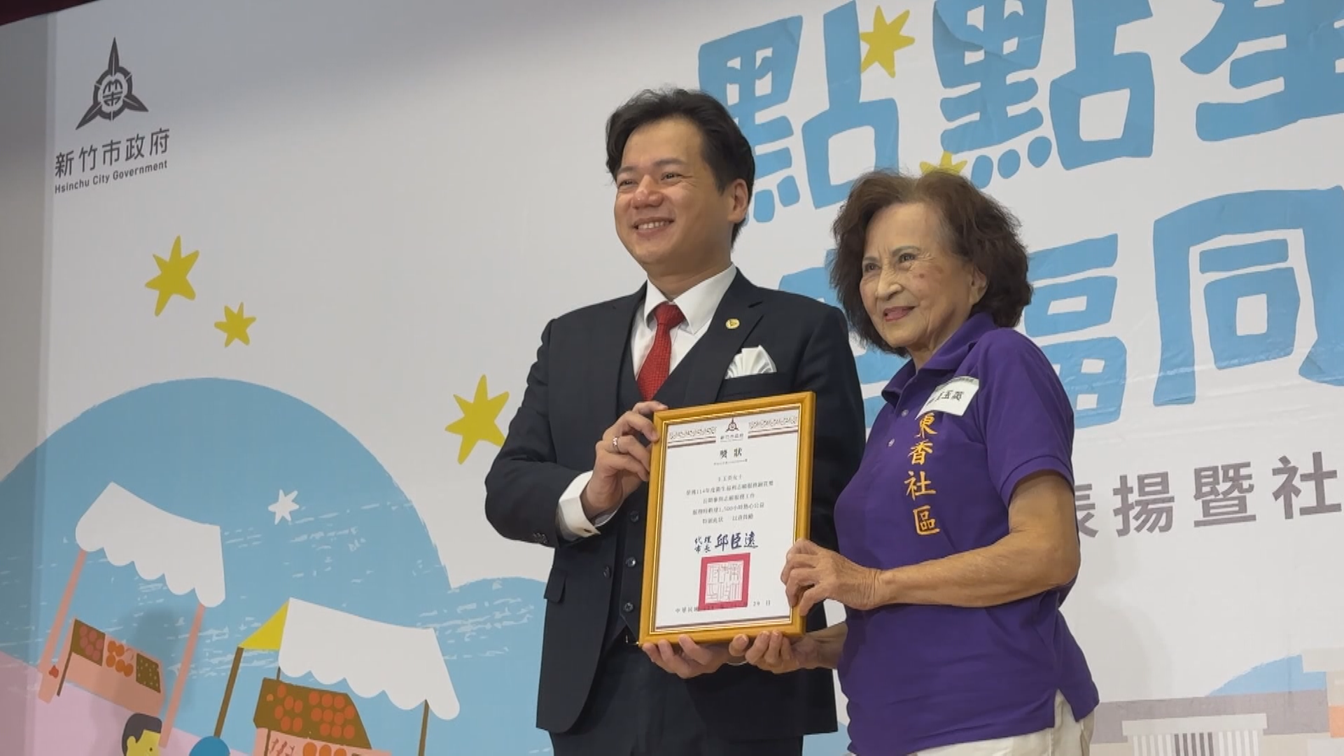 社區志工從代理市長邱臣遠的售中接過獎牌,114年新竹市志願服務表揚暨社區成果展,以「點點星光、幸福同行」為主題,志工們有如星光般閃耀,讓各單位有他們的身影更加的溫暖。