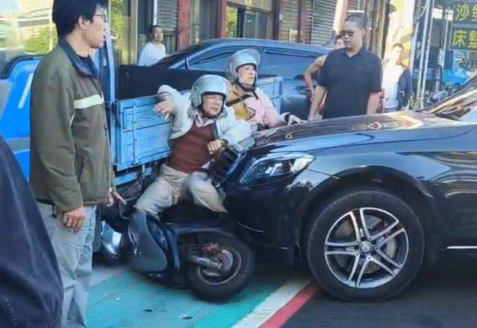 82歲阿伯開賓士網機車停等區衝,撞上雙載機車轎車,事發當時的影片在網路上曝光。