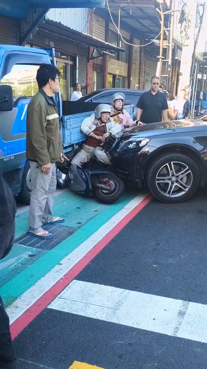 網友在Threads分享影片指出,7日下午成蘆橋下發生車禍事故,一名阿伯開賓士不明原因衝撞機車停等區雙載機車,阿伯被人攙扶下車,騎士跟乘客被夾在賓士跟小貨車中間動彈不得,旁邊民眾急著推開賓士救援。