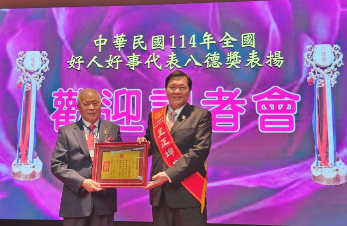 由中華民國表揚好人好事運動協會主辦的「114年全國好人好事代表八德獎頒獎典禮」,於12月10日在台北市政府青年局舉行,王正坤醫師以長年深耕醫療公益、扶助弱勢及回饋教育的卓越事蹟,榮獲「八德獎」殊榮,成為全國醫界與企業界兼具的典範代表。
