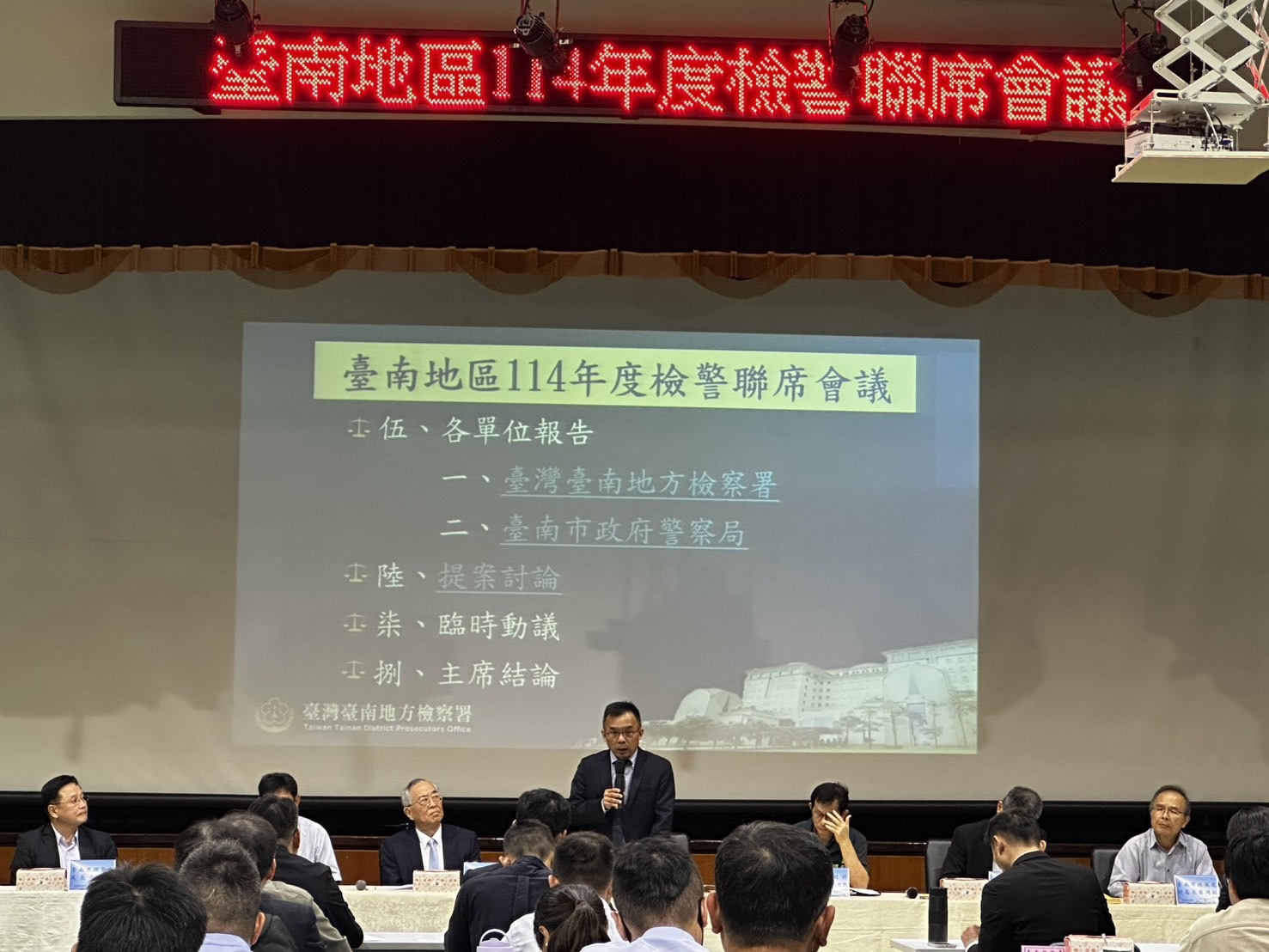 台南地檢署於12月10日下午在該署9樓大禮堂召開「114年度檢警聯席會議」,由台南地檢署鍾和憲檢察長親自主持,邀請台灣高等檢察署台南檢察分署黃玉垣檢察長、台灣臺南地方法院馮君傑法庭長蒞臨指導,並有台南市政府副秘書長殷世熙、政風處葉鴻銘副處長、台南市政府警察局局長林國清、法務部調查局台南市調查處處長高吉川、南部地區機動工作站主任陳育君、法務部廉政署南調組組長許嘉龍檢察官、台南憲兵隊上校隊長洪義傑、陸軍八軍團指揮部法務組上校組長洪培瀚,以及檢察官、台南地區各警察、調查、政風、軍事、海巡、移民、矯正、消防、衛生、林務、稅務、關務、港務、水利、教育等單位代表共百餘人與會。