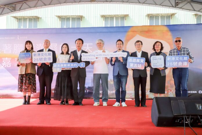 「跟著朦朧潮濕的一天回嘉」在具有歷史風貌的新港文化館25號倉庫展出,將「朦朧潮濕的一天」女孩形象結合阿里山太平雲梯的黃昏雲海,呈現嘉義獨特的自然景致。