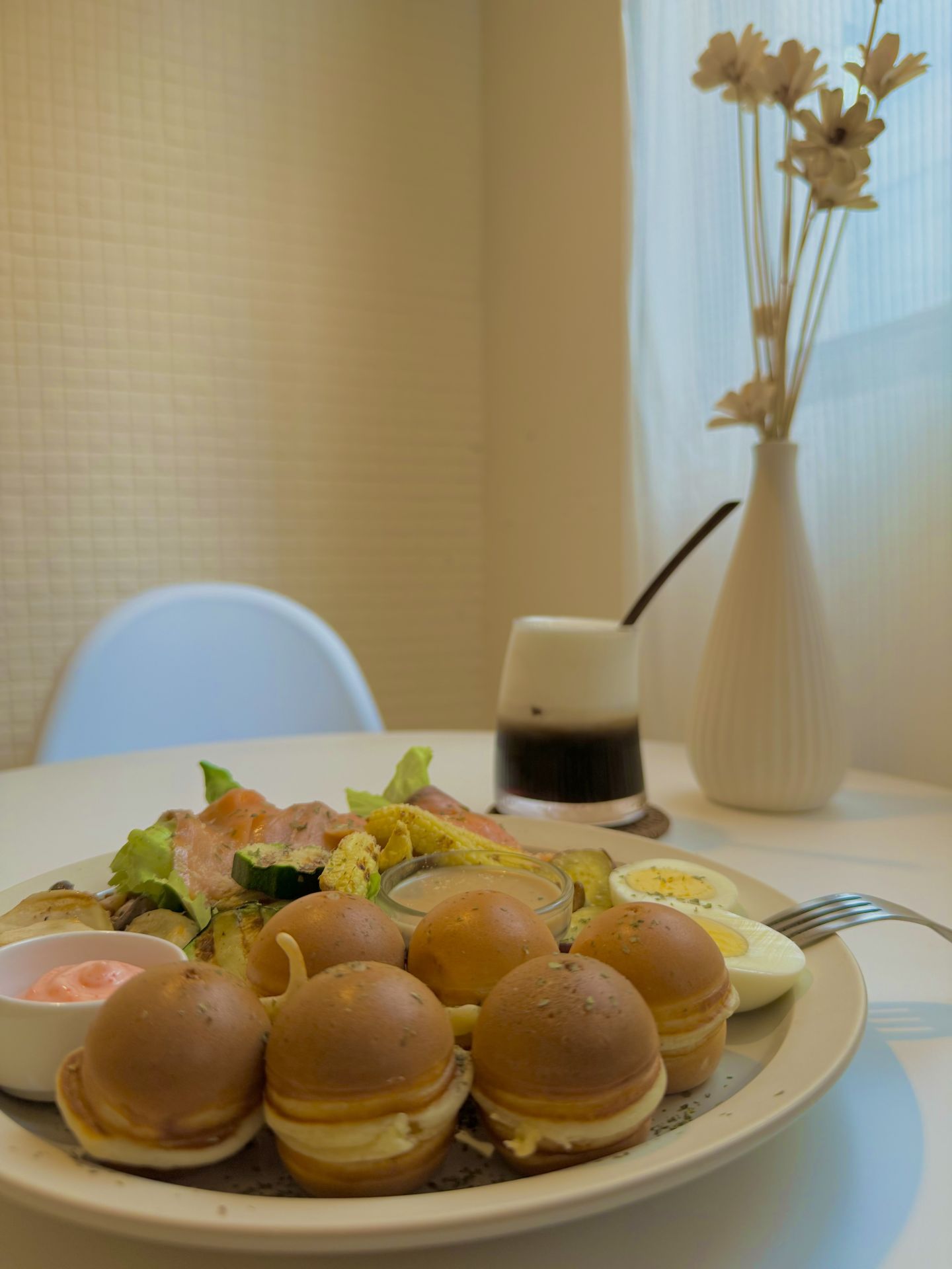 裴偉又點了3個鹹口味的鬆餅球,包括「明太子肉鬆鬆餅球」、「腸腸起司鬆餅球」,以及「牽絲起司鬆餅球」,他點出鬆餅球的特色,「鬆餅像個載具一樣,鬆餅本身好像沒有調味,所有味道都來自於它所要乘載的東西」。