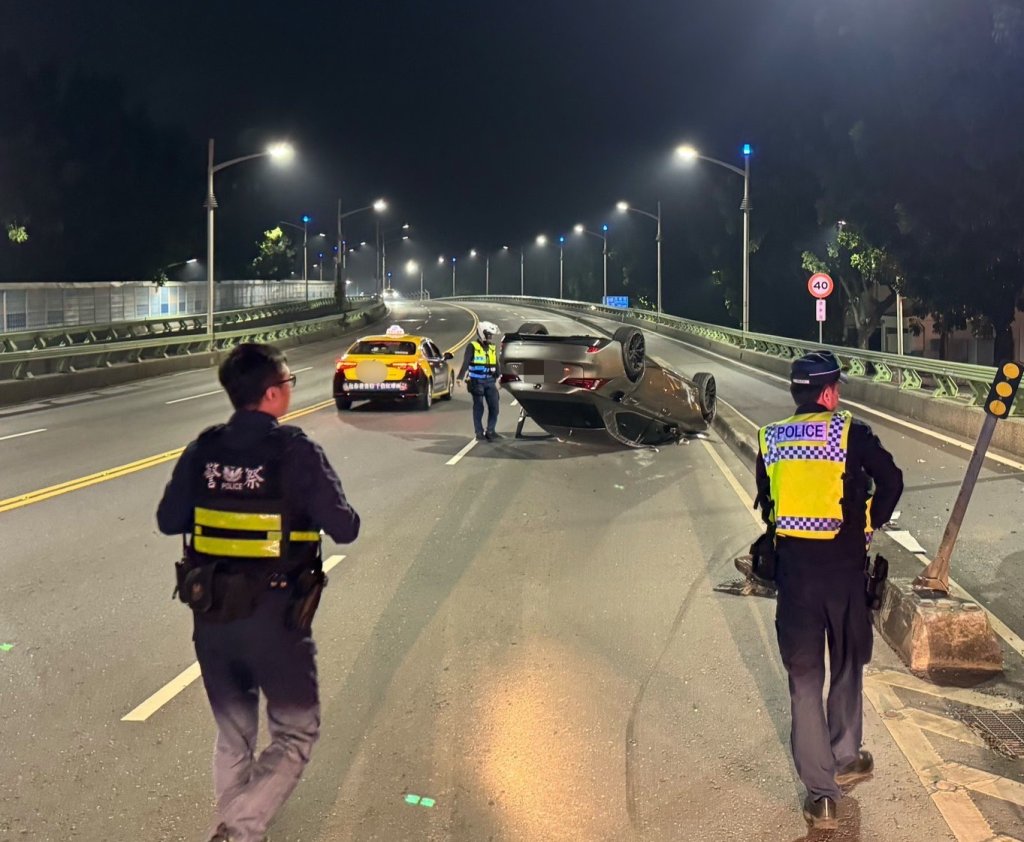 由於撞擊力道猛烈,黑色自小客車當場失控翻覆,車身整個橫躺在車道上,楠梓分局警方獲報後,立即與消防人員火速趕往現場處理,除了先封鎖管制車道、疏導交通,更趕緊協助受困車內的黃男脫困,將他送往醫院進行治療。所幸,黃男命大,送醫後檢查僅受到輕傷,且意識清楚,沒有生命危險。警方也隨即對黃姓駕駛進行酒測,證實他並沒有飲酒情事。至於詳細的肇事責任仍需進一步調查,後續將移請交通大隊進行專業的分析研判。肇事原因待釐清。