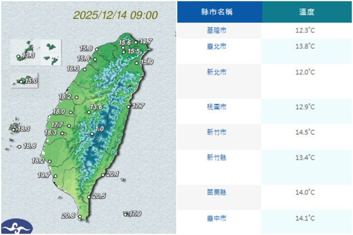 1214受到大陸冷氣團影響,平地地區也明顯降溫偏冷。(圖/氣象署)