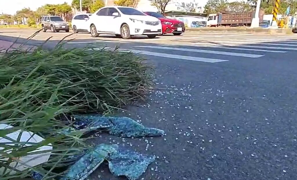 台中龍井發生疑因男女感情糾紛引發砸車、駕車衝撞事件,現場留下被砸車輛車上的碎片。翻攝畫面