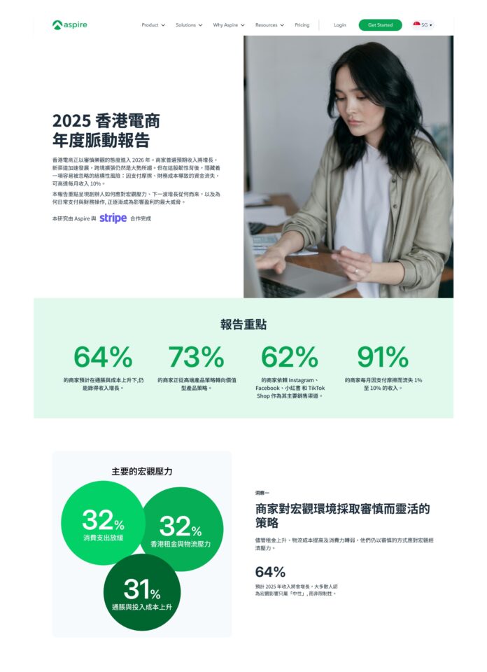 Aspire 聯合創始人兼CEO Andrea Baronchelli 表示:「調查數據講述了一個了不起的故事:香港商家以驚人速度與靈活性應對宏觀挑戰。他們正在重塑產品線、調整定價策略,並全力拓展『發現式商務』(Discovery-led Commerce) ;可惜,『支付摩擦』卻不斷削弱這些成果。當商家準備擴張多市場之際,他們同步需要高透明度、融洽、無縫跨境支付服務等金融基建,才能釋放更大增長潛力。」