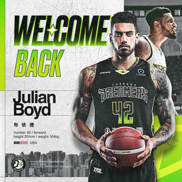福爾摩沙夢想家今 (16) 日正式宣布,曾於 2021–22 與 2023–24 賽季效力球隊的布依德(Julian Boyd)再度披上夢想家戰袍,這也是他第三度回歸夢想家,重返熟悉的舞台,為團隊在攻防兩端注入即戰力。