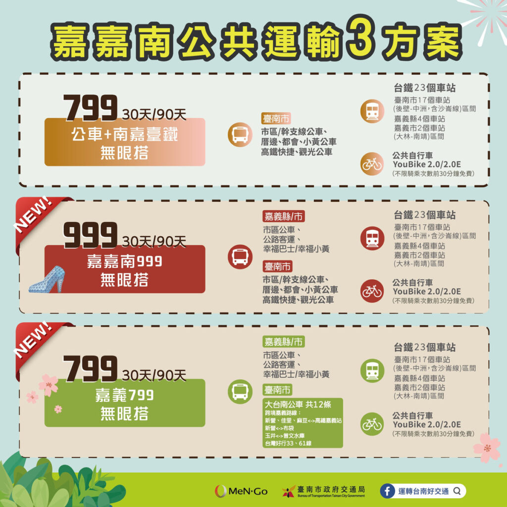 台南市長黃偉哲表示,據統計臺南與嘉義間台鐵平均每月通勤量超過16萬人次,是緊密的生活圈,為減輕臺南市民的通勤成本,繼9月15日推出「799大台南公車+南嘉臺鐵無限搭」後,特別指示交通局與嘉義縣、市協商整合,克服以往售票平台不同問題,再擴充推出「嘉嘉南999無限搭」定期票方案,即日起嘉嘉南地區所有公共運輸只要999元即可一卡暢遊吃到飽。