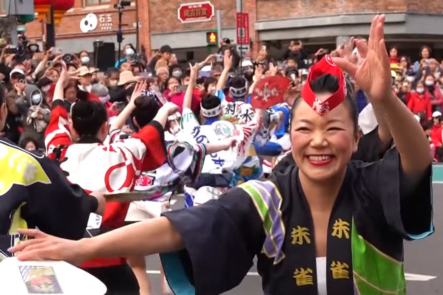舞者隨著樂聲悠揚起舞,日本東京高圓寺阿波舞,在桃園景福宮前中正路封街熱鬧開跳。色彩繽紛的服裝、整齊劃一的舞步,吸引大批民眾駐足圍觀,手機拍不停,老城區難得出現滿滿人潮。