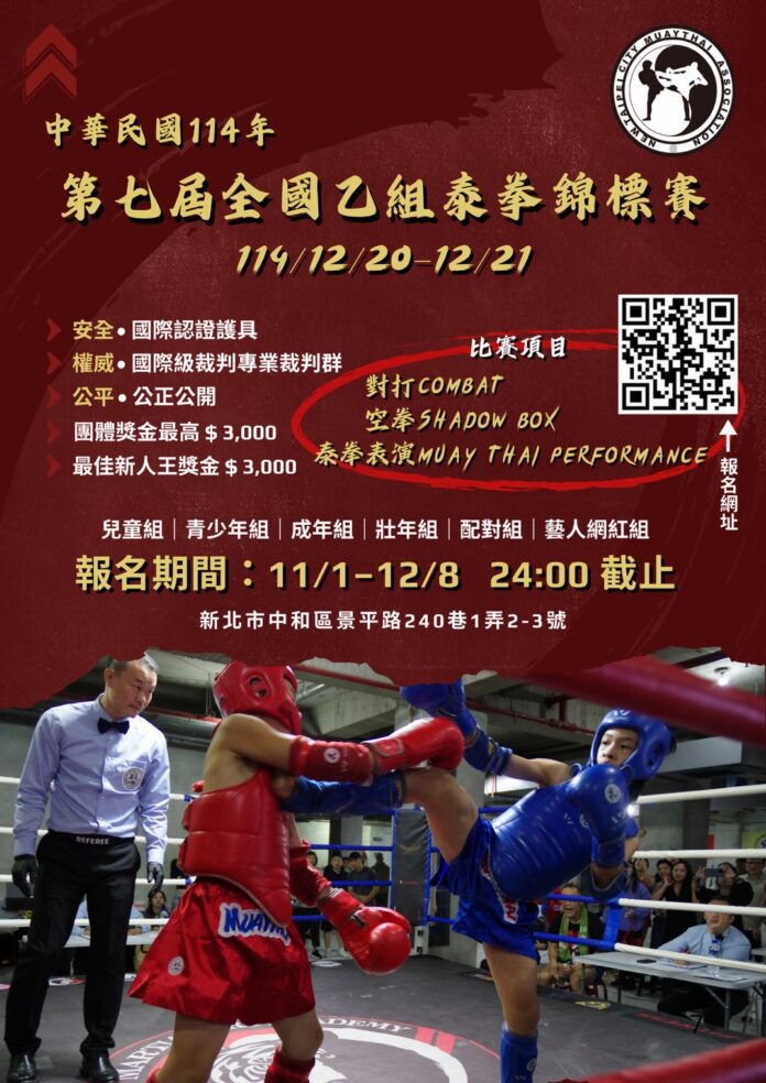 為持續推廣泰拳運動、強化國內選手實戰經驗與競技水準,「114年第七屆全國乙組泰拳錦標賽」將於114年12月20日至21日,在武術格鬥學院中和館隆重舉行。賽事集結全台各地泰拳好手同場較勁,預期將為年底體壇掀起一波熱血沸騰的泰拳旋風。