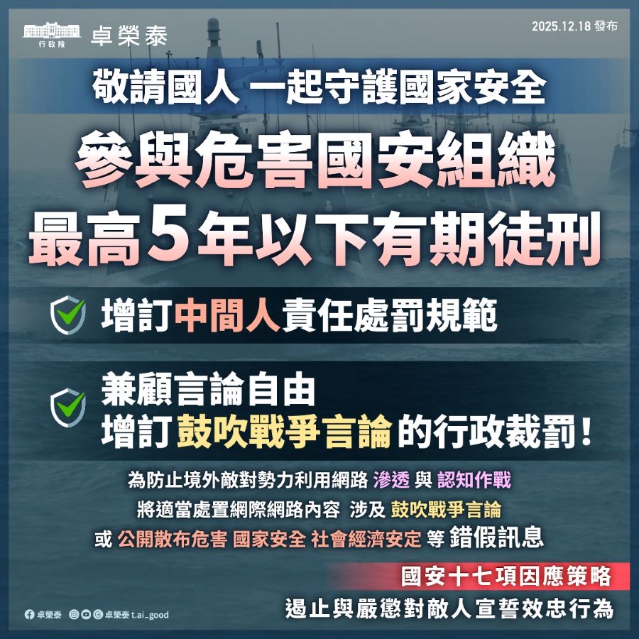 此外,卓院長表示,基於《公民與政治權利國際公約》第20條第1項規定的要求,並同時兼顧言論自由的保障下,此次增訂鼓吹戰爭言論的行政裁罰,最高可罰100萬元,同時針對網際網路內容涉及鼓吹戰爭言論,或公開散布危害國家安全、社會經濟安定等錯假訊息,予以適當處置,以遏止境外敵對勢力宣傳、滲透及認知作戰的威脅。