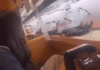 台北客運公車在新店北新路二段寶強路口要右轉,機車同樣要右轉結果被在公車與人行道中間,造成騎士左腳踝骨折。翻攝畫面
