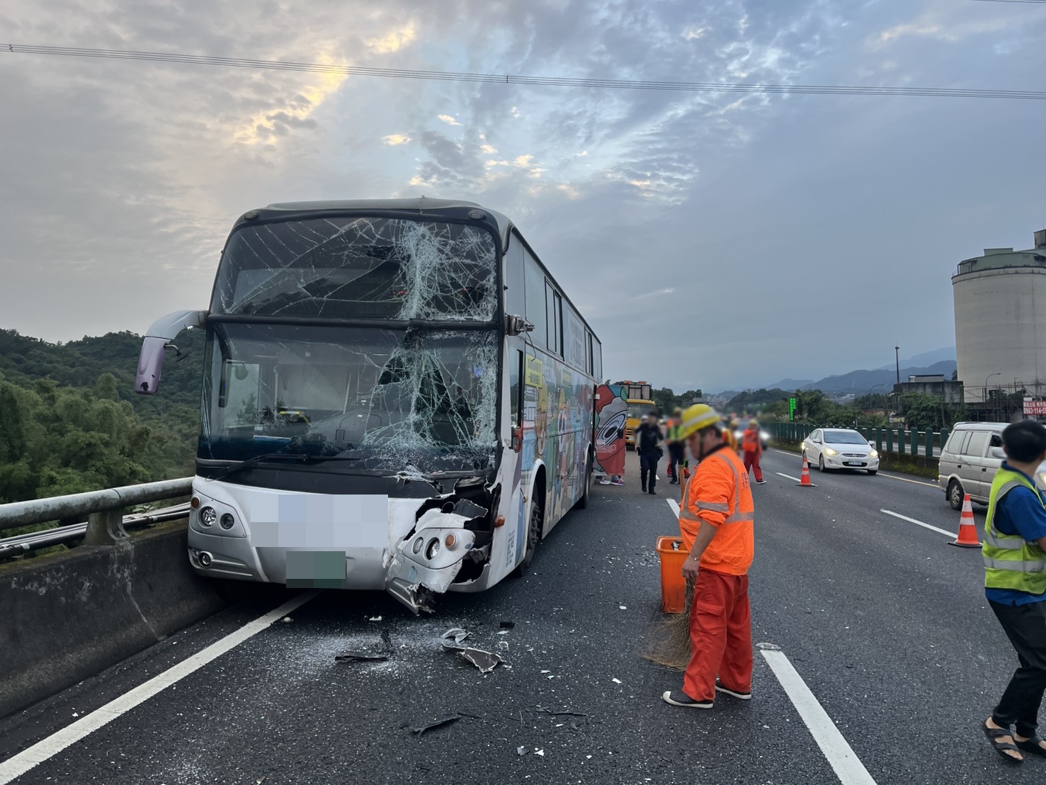 國道客運車上載有40名乘客,其中有6名乘客送醫檢查均無大礙,事故現場於8時54分完全排除,恢復通車,後方回堵約6公里,警方將循線追查掉落水桶車輛,通知到案說明,各車駕駛人酒測值均為零,詳細的肇事原因有待警方進一步釐清。