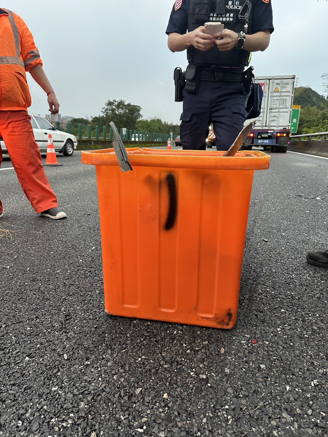 呼籲用路人開車應隨時注意前方動態,遇到掉落物不要大動作閃避,來不及閃避放慢車速,撞到掉落物千萬不要停在車道上,將車輛停到路肩安全處所擺放故障標誌,使用1968App警政報案或是撥打1968、110電話報案,車輛如果可以移動,可就近至各個國道警察單位報案,不論駕駛及前後座乘客均應繫妥安全帶,以維行車安全。